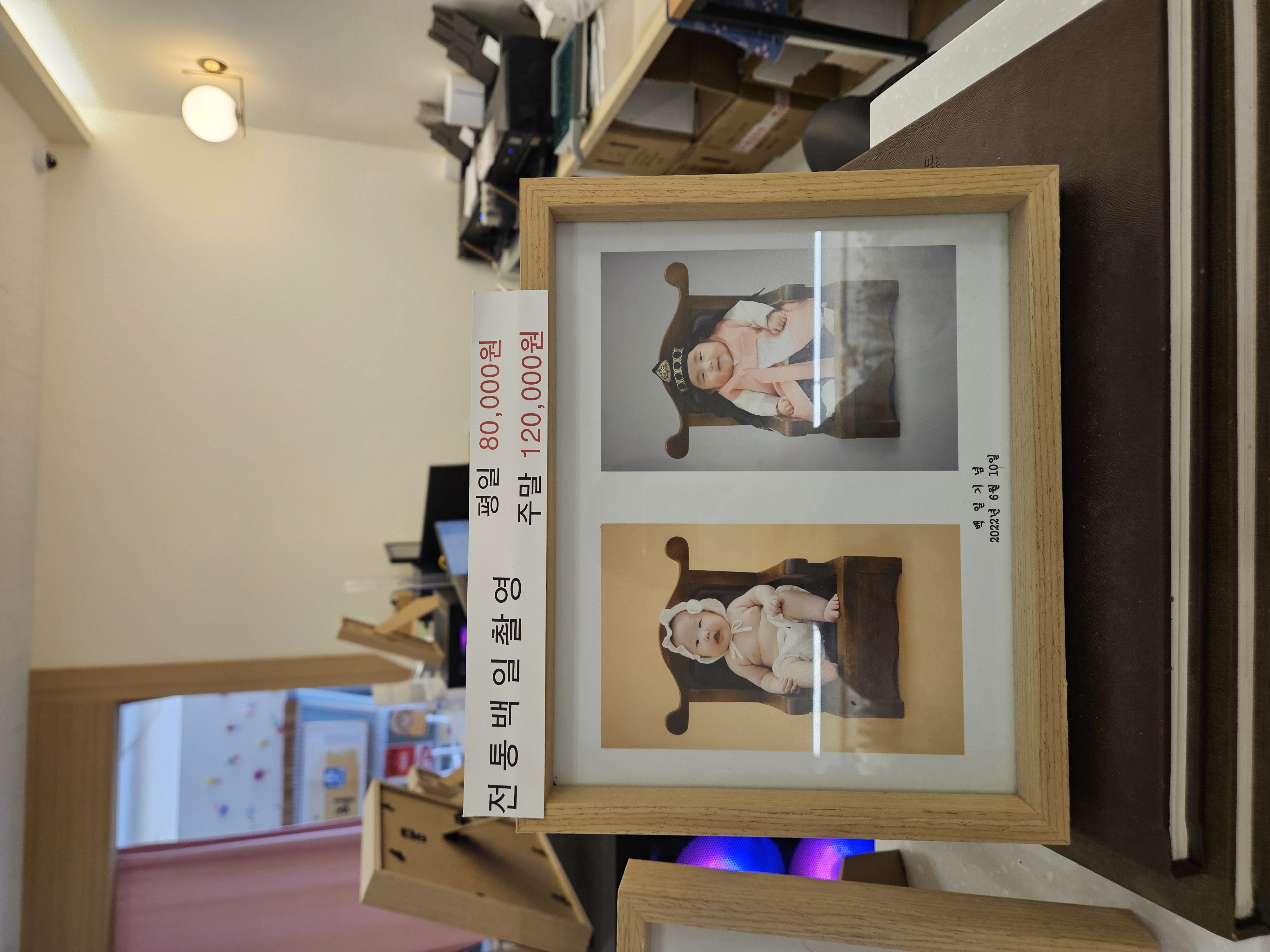 단색배경에 깔끔하게 사진이 나왔습니다. 두 사진 같이 한 액자에 담을 수도 있고 각각 따로 액자를 만들 수도 있는데 저희는 각각 따로 액자에 담는 것을 선택했습니다. 양가 부모님께 아기 액자를 드리려고 한쌍 더 구매를 했고 저희는 사진 인화본만 따로 구매를 했네요. 인화본은 작은 액자 사이즈로 한장당 5천원에 구매를 했습니다.