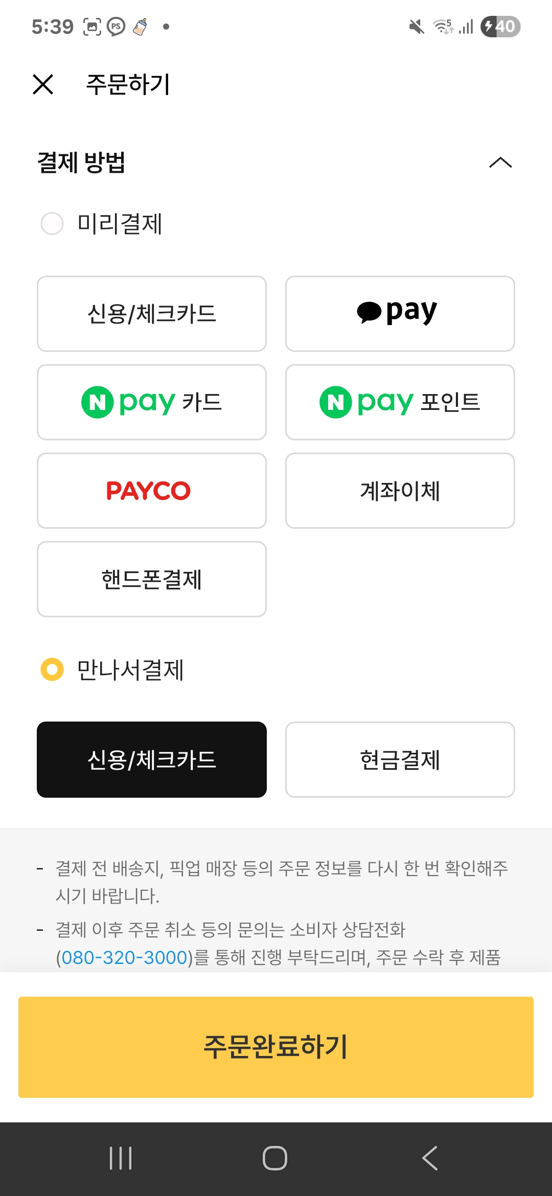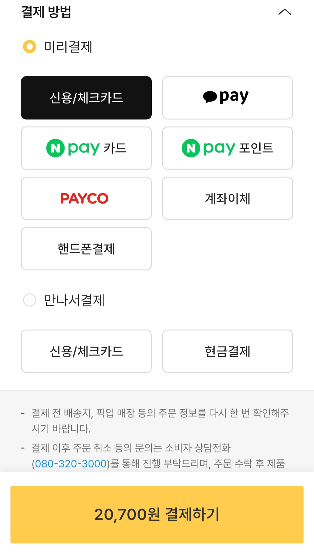 마지막으로 추가적으로 할인을 더 받는 방법은 만나서결제를 선택하는 방법이 있다. 민생회복쿠폰 사용가능한 매장은 민생회복쿠폰을 사용할 수도 있고 지역사랑상품권을 사용할 수 도 있으니 가지고 계신분들은 만나서 결제를 선택하고 매장에 직접가서 결제를 하면 될 것 같다.