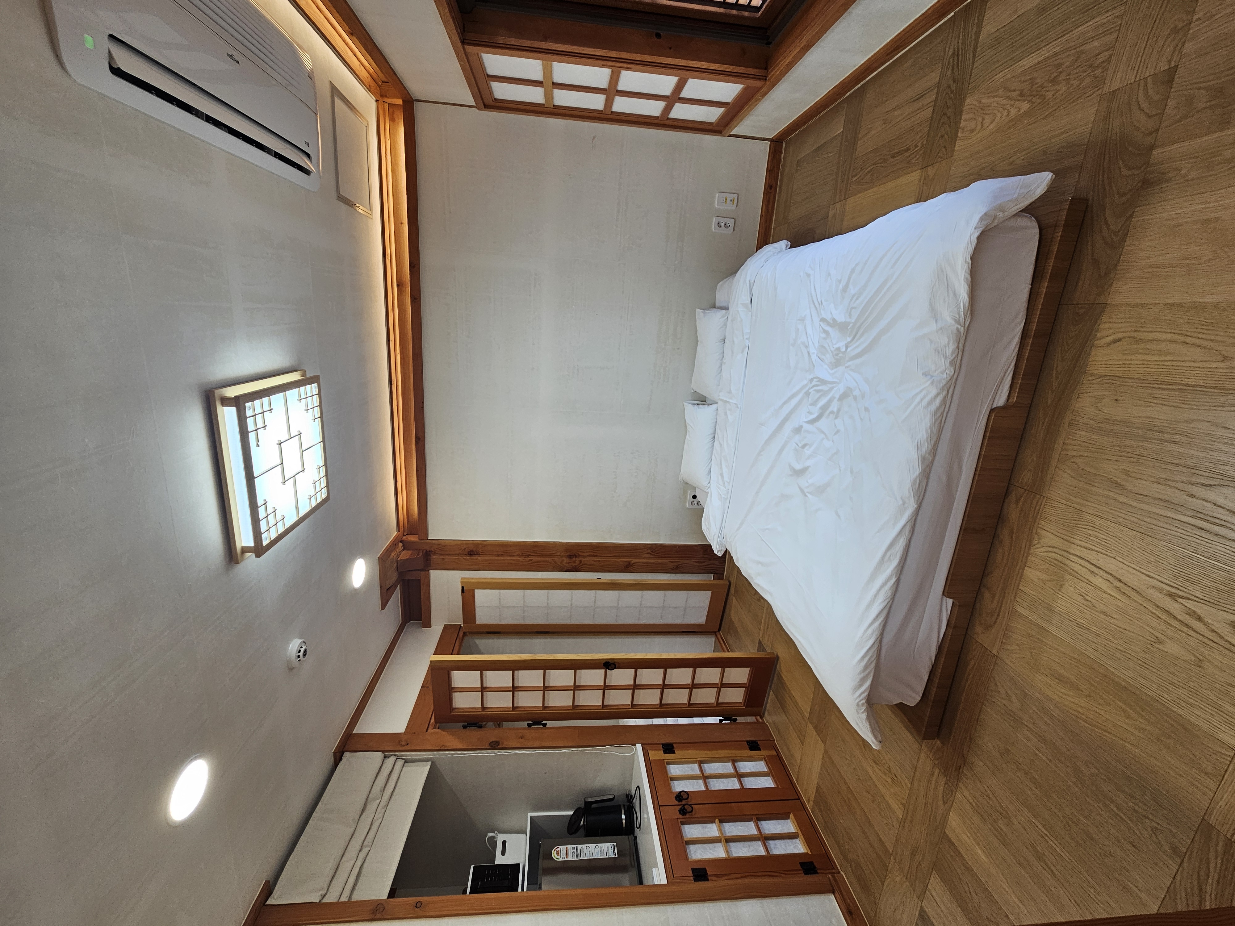 외부가 한옥이라 내부도 옛날식 한옥이어서 더울 것 같다고 생각한다면 오산입니다. 옛날 한옥같은 느낌은 유지하되 현대식 시스템 에어컨이 방마다 갖추어져 있습니다. 방은 2개에 거실 하나로 구성되어 있고 아기 이유식을 데울 수 있는 전자렌지와 분유 만들때 필요한 커피포트 까지 다 갖추고 있습니다. 미니 냉장고에 물도 넉넉하게 준비해주셨어요.