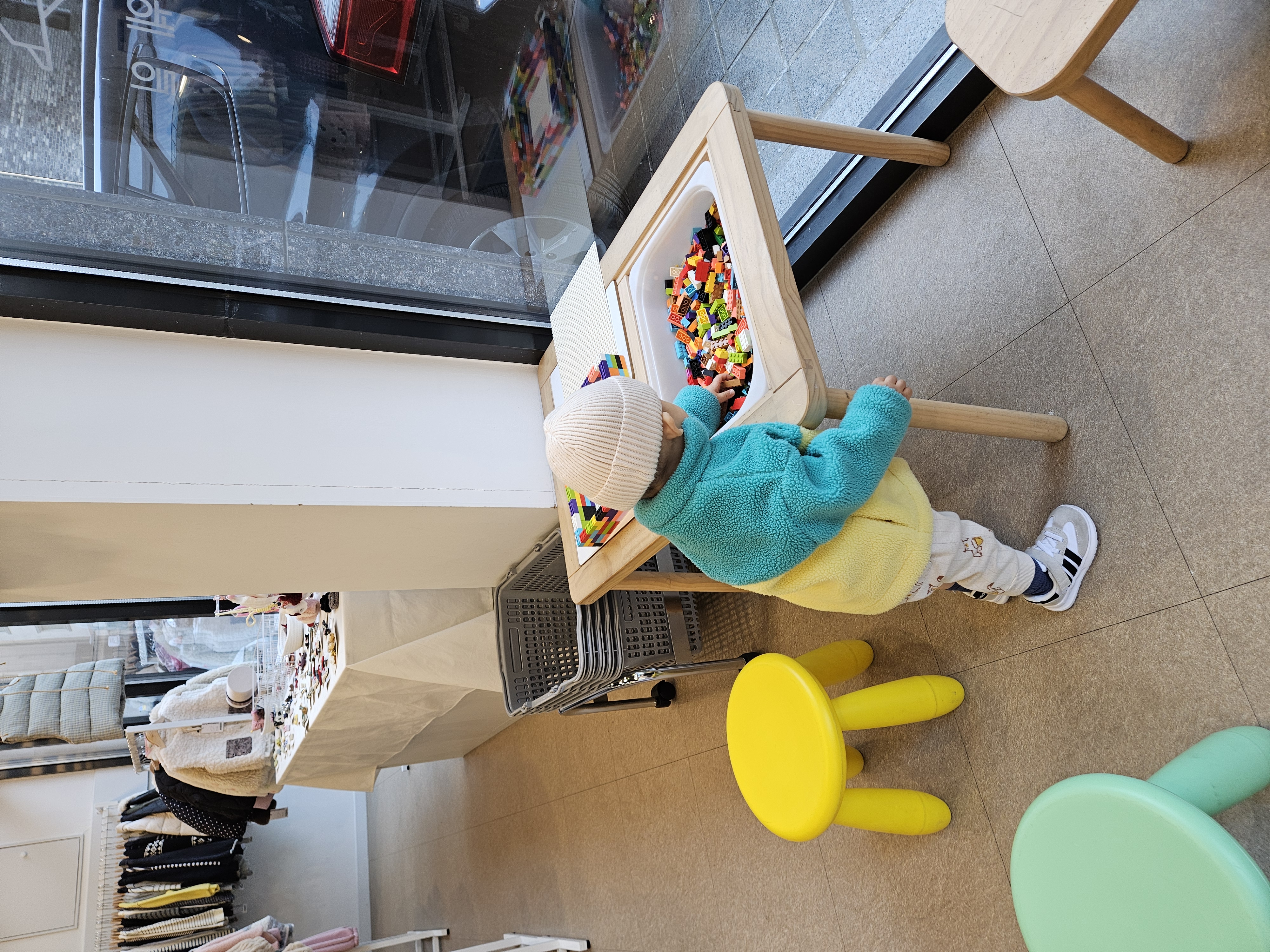 엄마아빠 쇼핑하는 동안 아기들 심심하지 않게 하려고 레고와 아기 쇼핑카트가 있다.