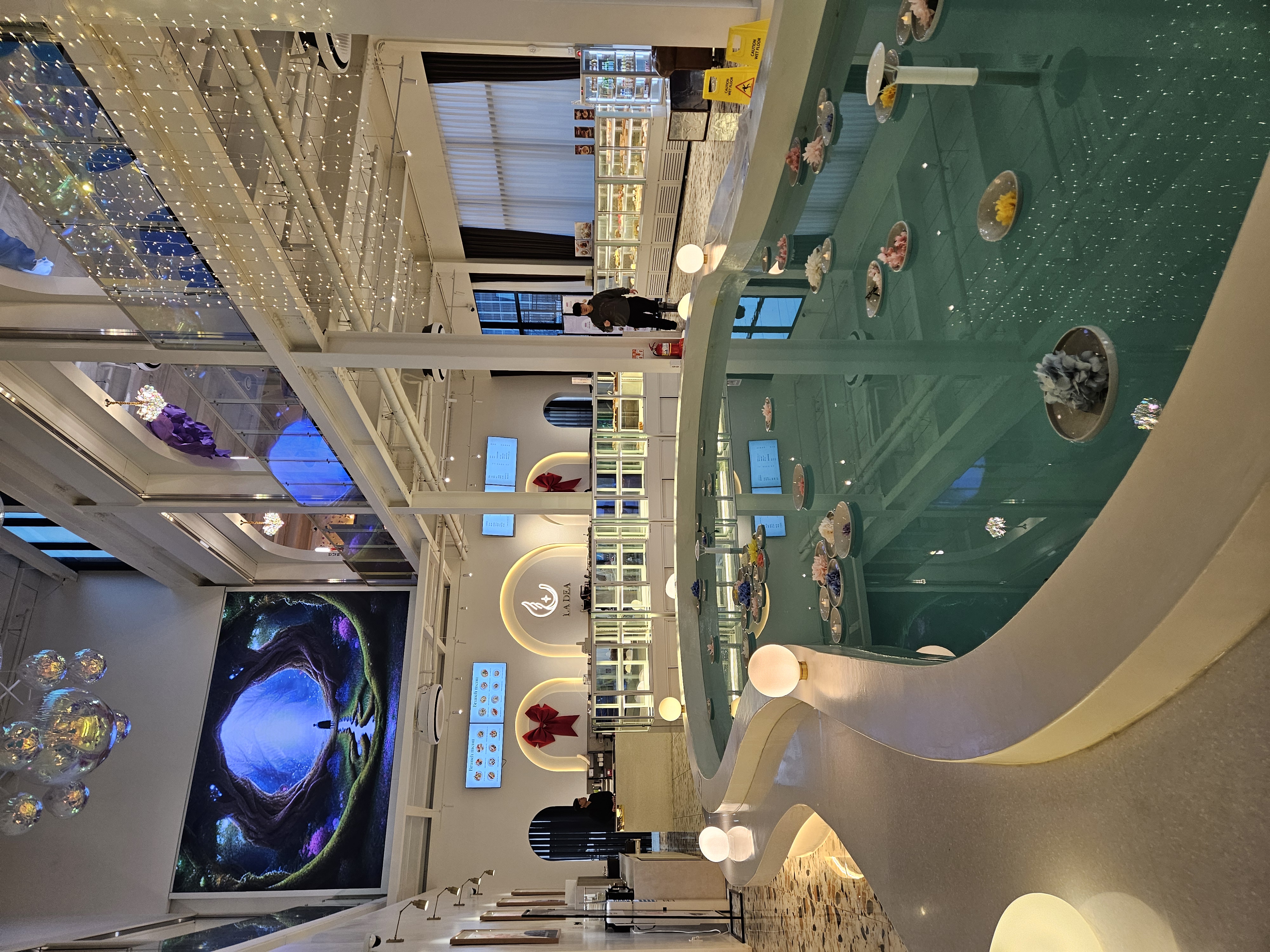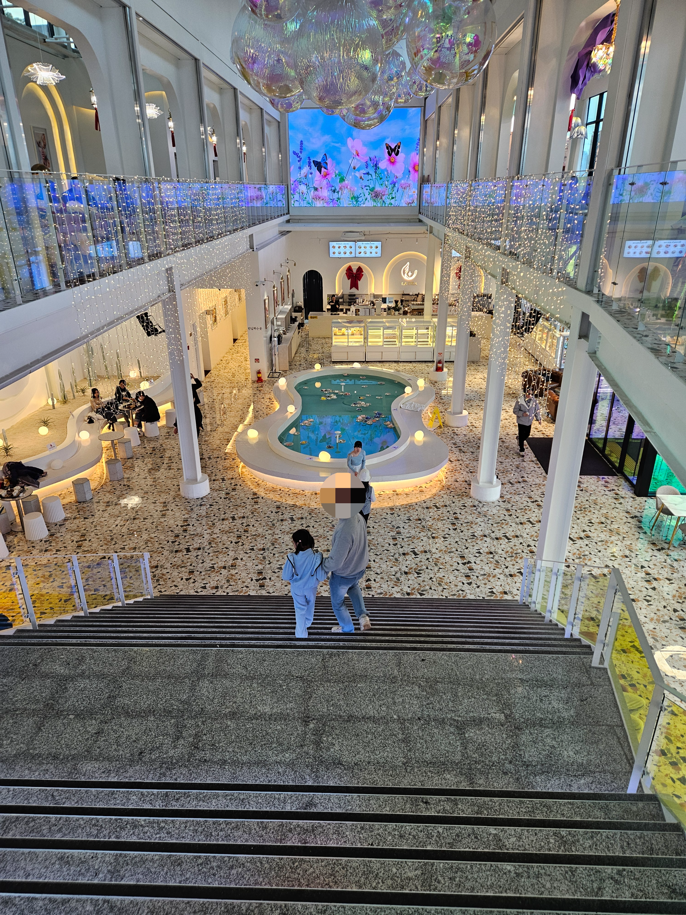 카페 내부는 1층과 2층으로 되어 있습니다. 2층까지 있는 카페라 그런지 천장이 시원시원하네요. 전체적으로 밝은 분위기에 가운데에는 인공연못이 있습니다. 일단은 넓은 공간에 마음이 탁트이고 아기자기하게 잘 꾸며놓은 볼거리도 있어서 들어가자마자 기분이 좋아졌습니다.