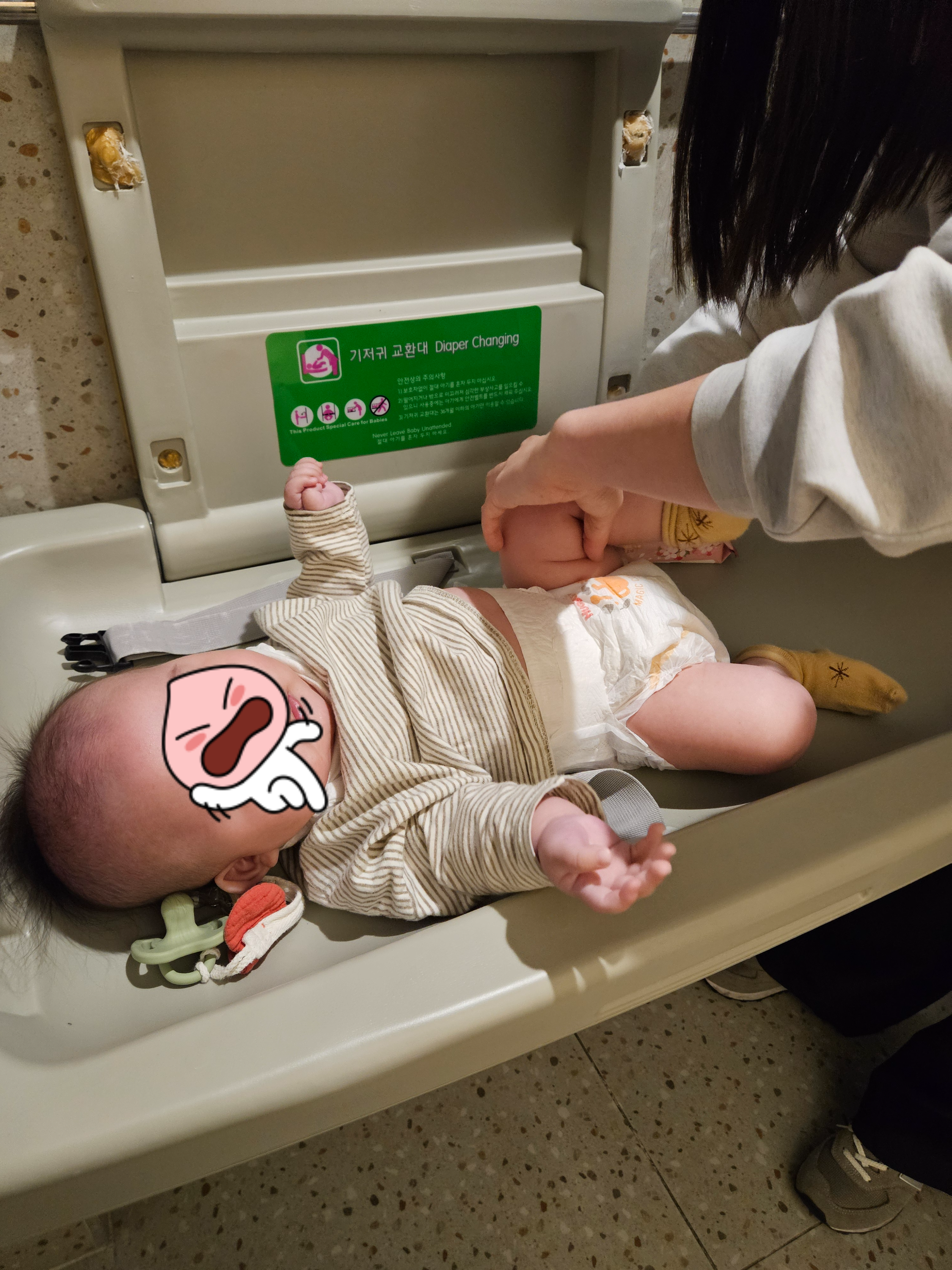 아기랑 같이 가면 수유나 기저귀 가는 시설이 있는걸 먼저 찾게 되는데 여기는 그래도 남자, 여좌 화장실에 간이용 기저귀갈이대가 있네요. 바닥이 차갑긴 하지만 없는것보다는 있는게 좋네요. 아기가 응가를해서 후딱 갈았습니다. 수유하는 시설은 따로 없는 데 그냥 카페 앉은 좌석에서 수유해도 문제를 없었습니다~