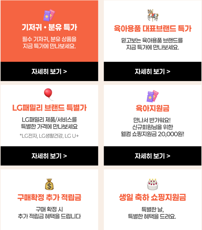 현재는 기저귀, 분유 특가할인 뿐만아니라 육아용품, 전자제품들도 특별가로 구매할 수 있도록 혜택을 주고 있습니다. 또한 신규로 가입하면 육아지원금으로 2만원을 주고 물품을 구매하면 적립금도 추가로 주고 있습니다.