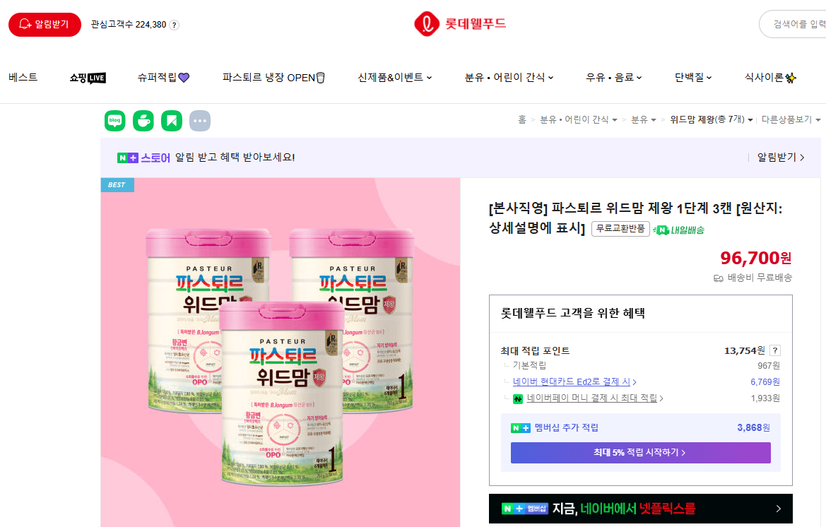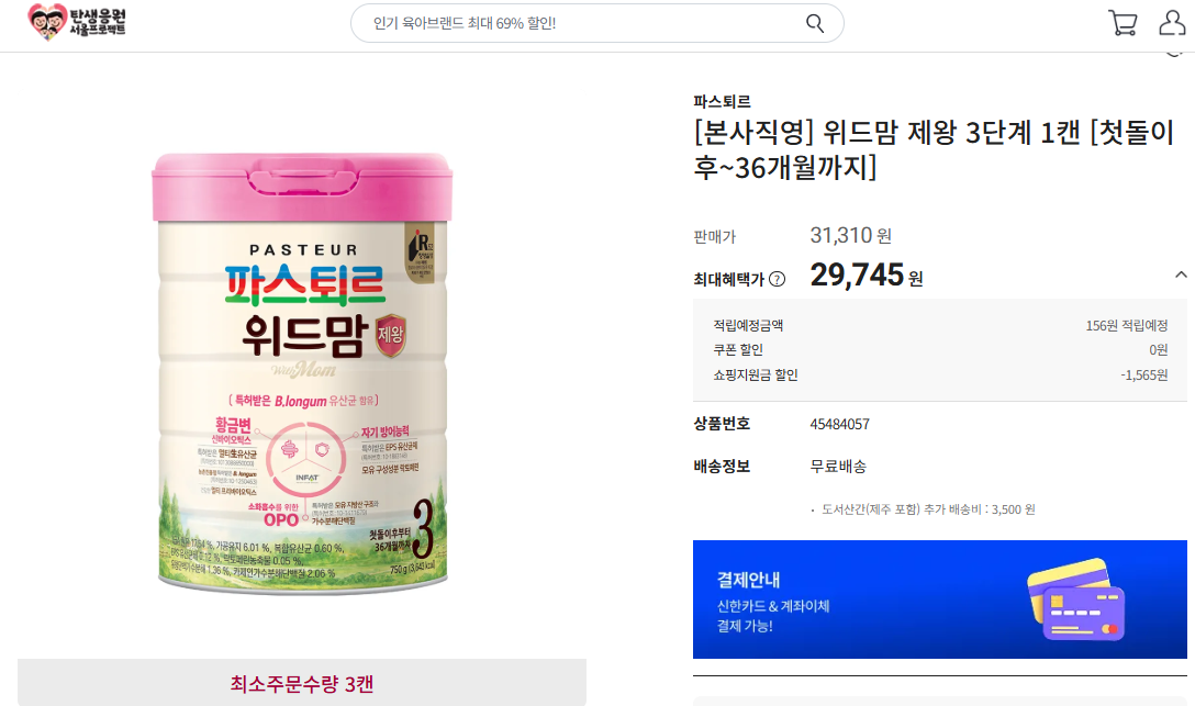 저는 정말로 분유가격이 인터넷에서 사는 것보다 저렴한가를 한번 비교해보았습니다. 상품이 너무 많아서 제가 처음 이용했던 분유인 파스퇴르 위드맘 분유를 비교해봤는데요. 시중에 롯데웰푸드 사이트에서 파는 가격은 3통에 96,700원인데 탄생응원몰에서는 쇼핑지원금 할인까지 받아 3통에 89,235원으로 약 7,465원 저렴하게 구매할 수 있었습니다.