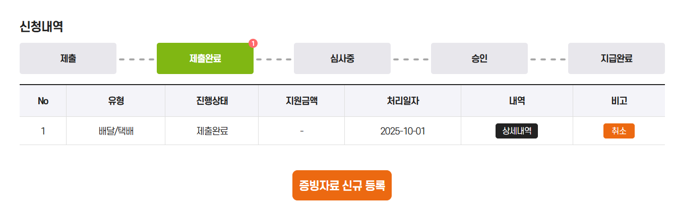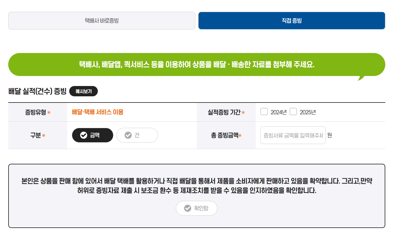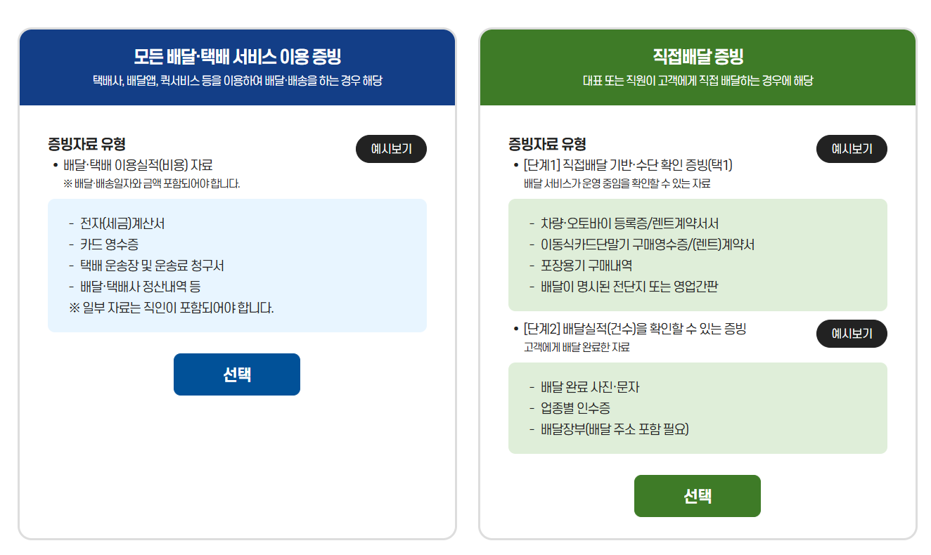 나는 편의점 택배를 이용하기 때문에 직접배달 증빙이 아닌 모든 배달, 택배 서비스 이용증빙으로 신청을 했다.