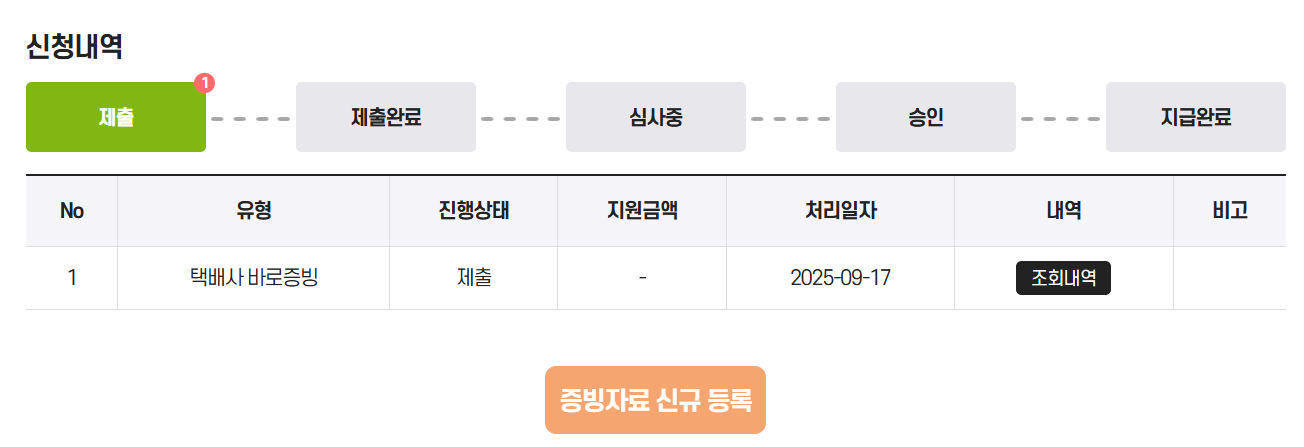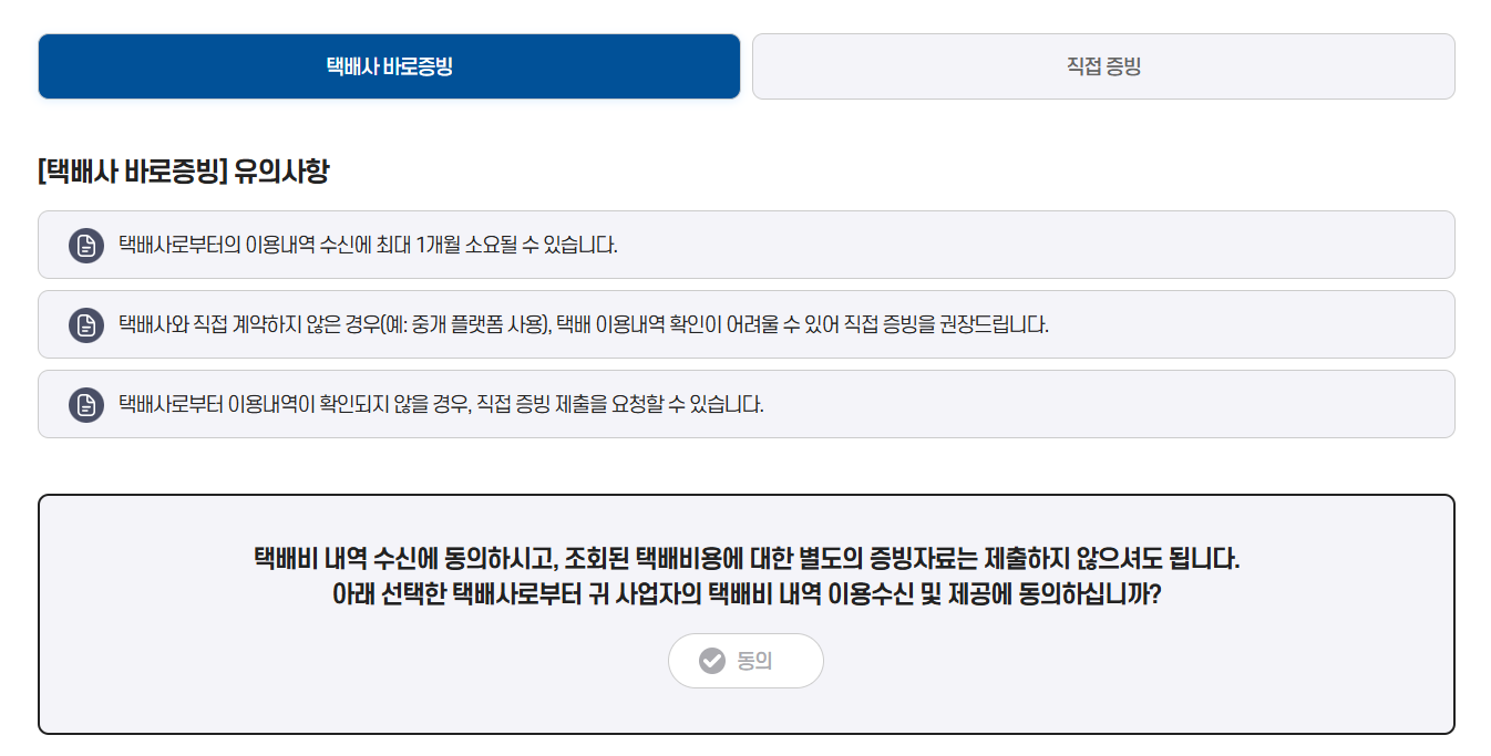처음에 신청할 때 잘 몰라서 택배사 바로증빙으로 선택을 하고 신청을 했다.