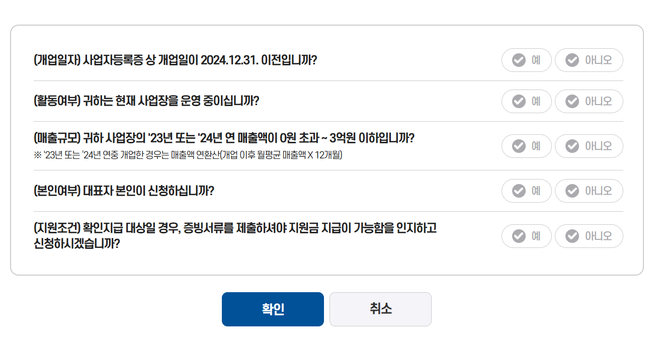 지원대상이 해당에 되는지는 개업일, 현재 사업장을 운영하는가, 매출액이 맞아야 신청이 가능하다.