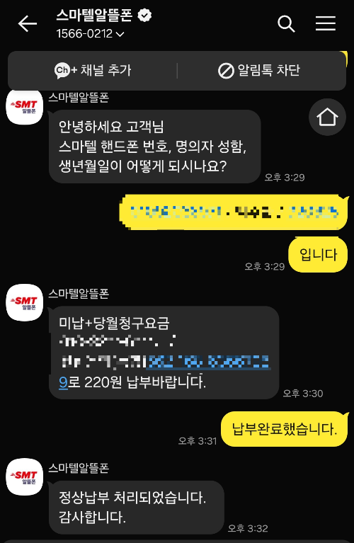 고객센터 번호도 있었는데 카카오톡 채팅으로도 문의를 받고 있어서 채팅이 더 빠를 것 같아서 연락을 시도했습니다. 5분도 안되서 답변이 왔고 체납문제를 신속하게 처리했습니다. 그리고 번호를 이동하여 다른 통신사로 개통을 할 수 있었습니다. 혹시라도 알뜰폰 통신사를 변경하시다가 이러한 문제가 생길 때에 이 글을 참고해서 진행하면 안 헤메고 바로 번호이동 개통을 하는데 도움이 되실 것 같습니다.