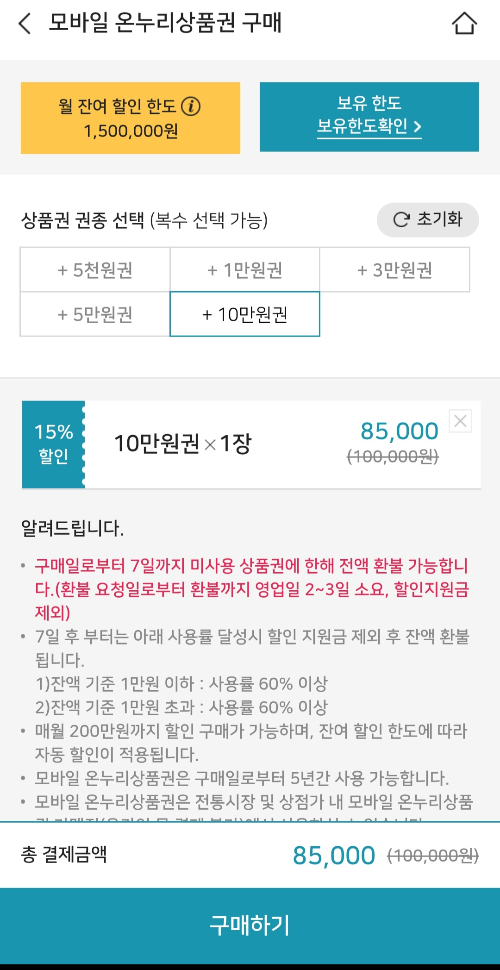 예로 10만원을 클릭하면 15%가 할인된 금액인 8만 5천원에 구매가 가능합니다.