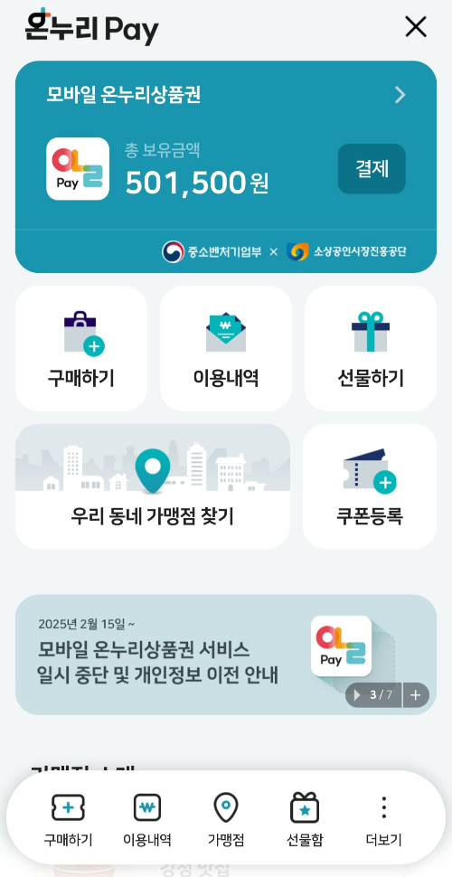 온누리 상품권은 서울페이처럼 사용처가 많지 않고 동네에 시장에서 주로 사용이 가능하니 주변에 시장이 있으신 분들이 사용하시면 유용합니다. 사용처가 궁금하실 땐 '우리 동네 가맹점 찾기'를 이용해서 주변 가맹점을 찾아주시면 됩니다.