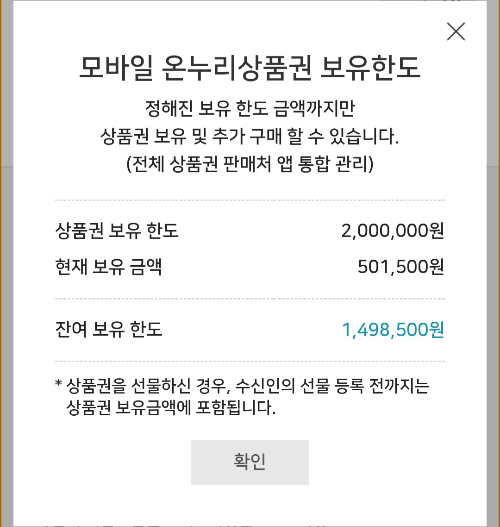 총 보유한도는 200만원까지 가능합니다. 만약 200만원을 구매하신다면