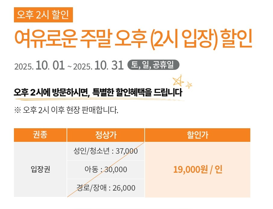 가족들이 많이 간다면 3대 대가족 할인을 받거나 오후시간대에 간다면 오후 입장할인을 받으면 좋을 것 같다.