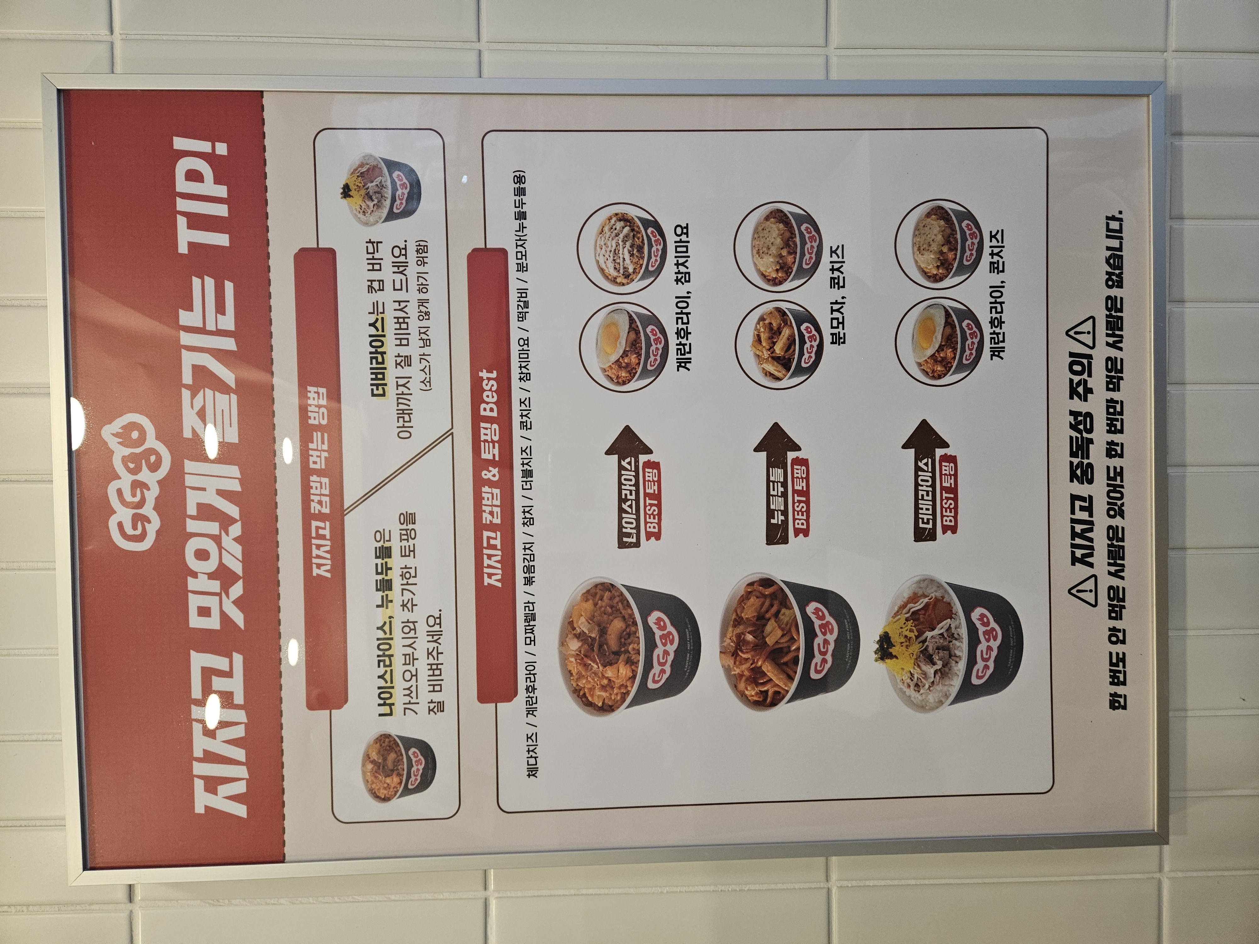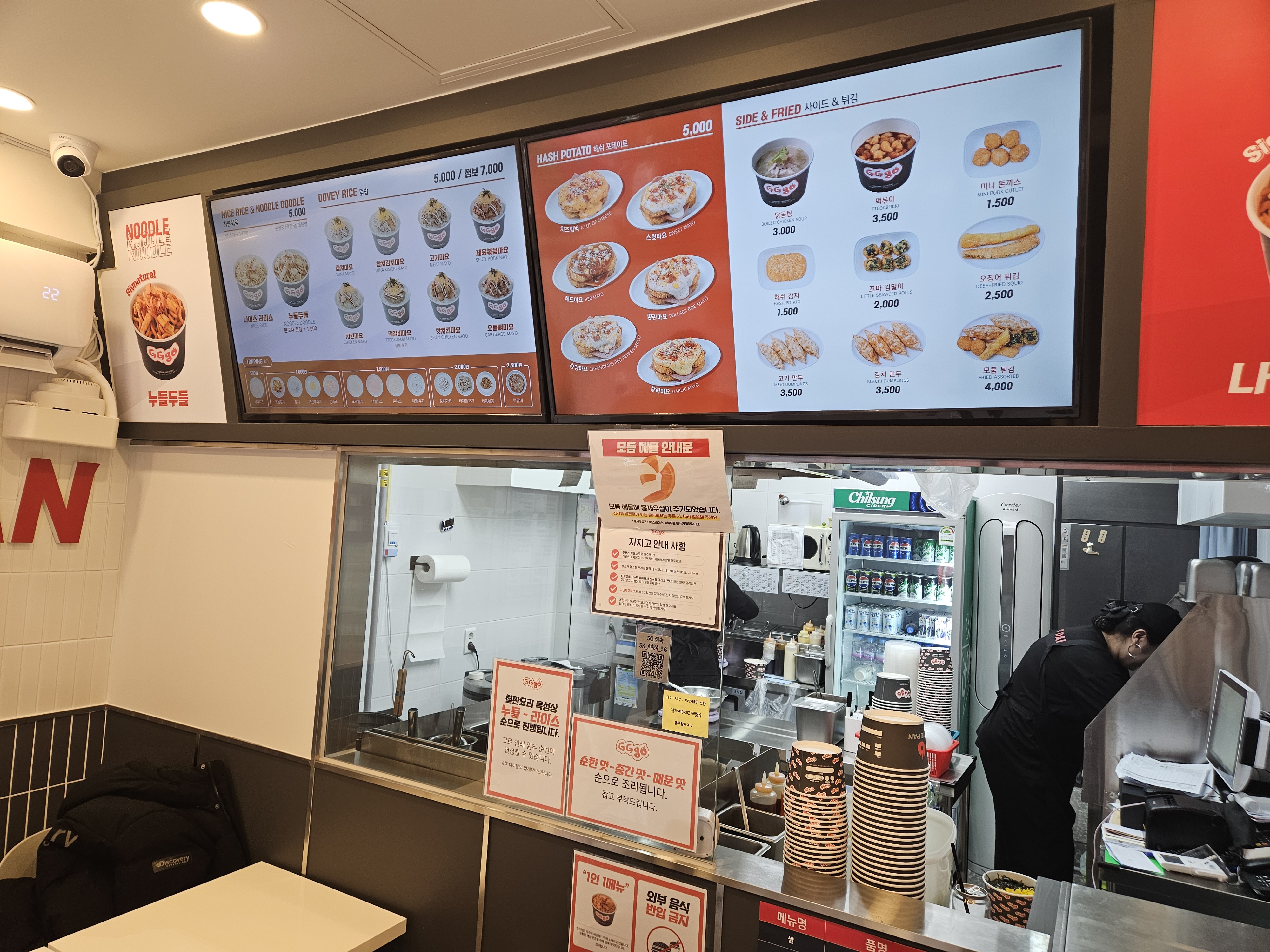 지지고는 컵밥과 누들, 떡볶이 해쉬포테이토를 메인으로 판매하고 있는데요~ 치킨마요를 정말 오랜만에 보네요. 해쉬포테이토도 여러 종류가 있어서 먹음직스러워 보입니다!