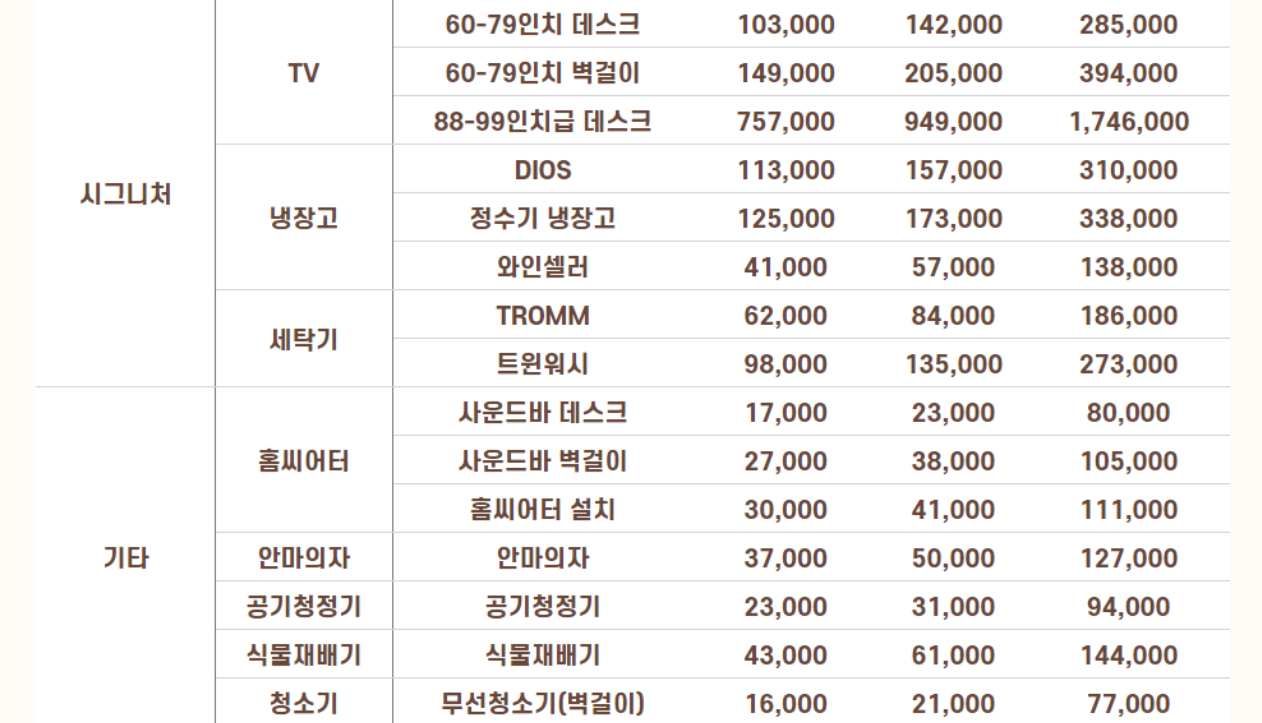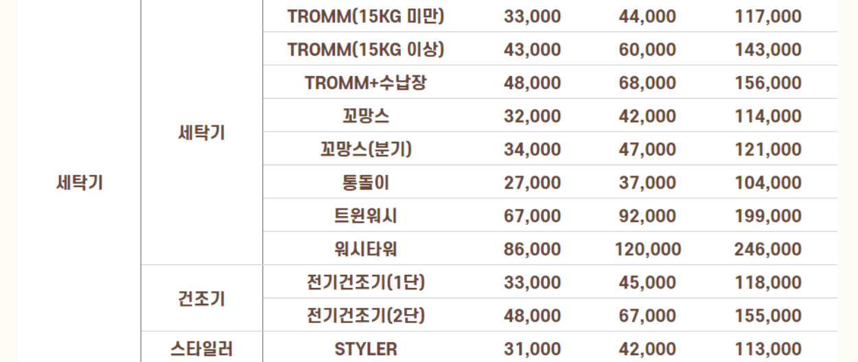 아래의 가격은 25년 3월 기준 LG전자 홈페이지에 있는 가전제품 별 철거, 설치, 이전설치 비용 가격입니다.