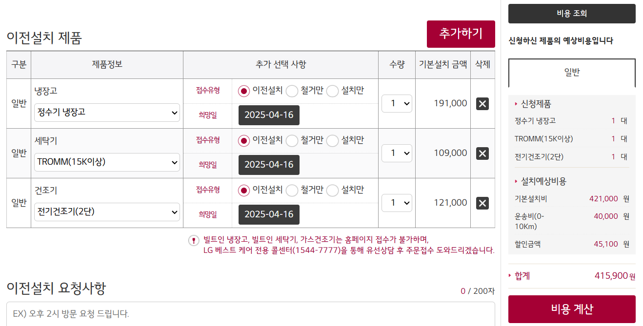 정수기 냉장고 이전설치가격 219,000원,TROMM 15KG 이상 이전설치가격 143,000원, 전기건조기 2단 155,000원의 비용이 발생하네요. 약 517,000원에 이전설치 비용이듭니다. 가전제품 3가지 옮기고 설치하는데 비용이 좀 나오네요.