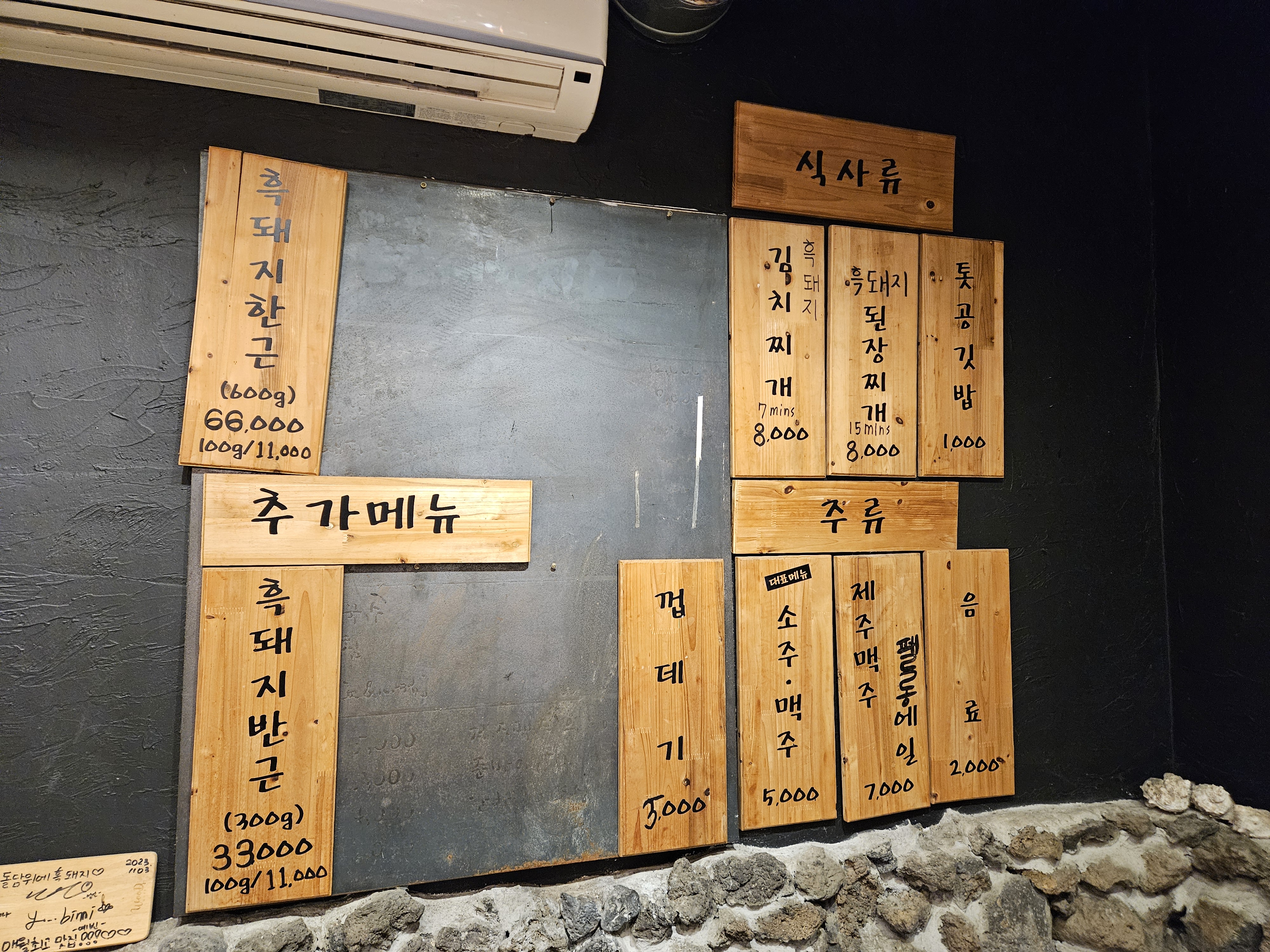 숙소 근처에 맛집들을 사장님이 알려주셨는데 그 중 흑돼지 고기 맛집인 돌담위에 흑돼지를 찾아갔다.