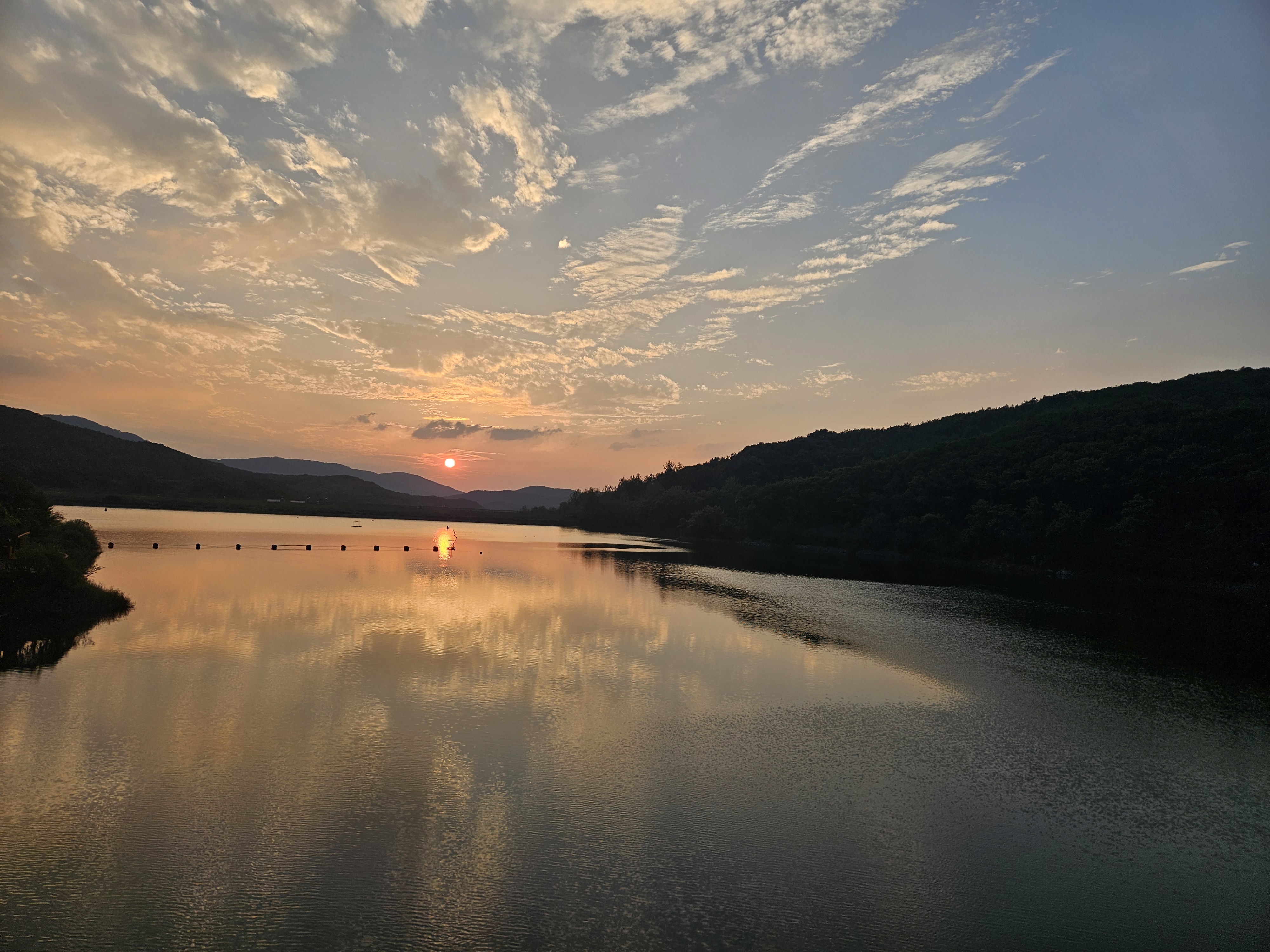 다리를 건너면서 마장호수의 노을이 지는 모습을 찍었다. 고요한 호수를 보니 마음이 편해졌다.