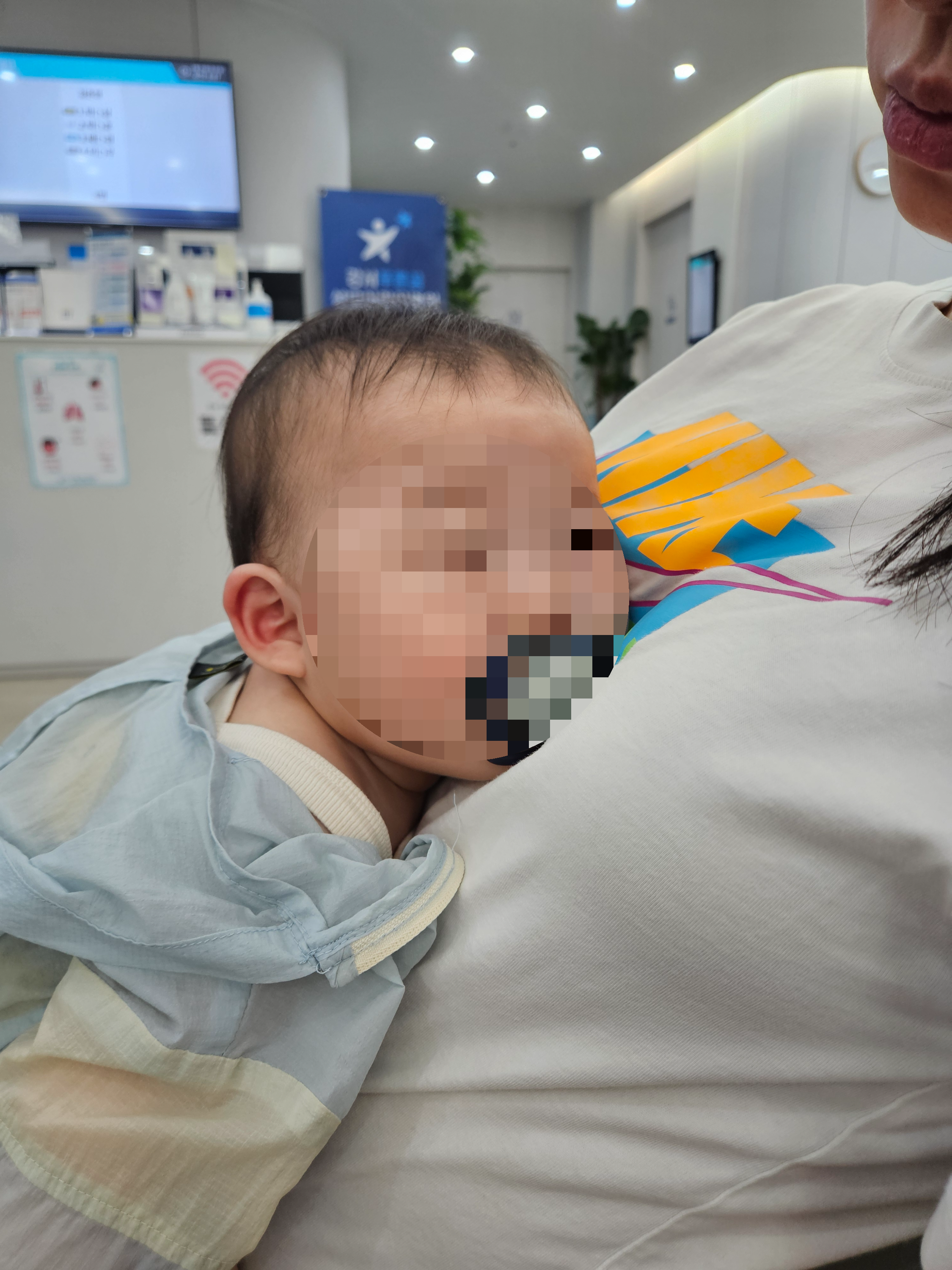 그렇게 5일 정도가 지나서 금요일 아침이 되었다. 보통 나는 7일 정도를 기준으로 잡고 그 이상 호전이 없으면 병원에 데려가려는 주의이다. 근데 금요일날 나는 아침운동을 하고 있었는데 아내에게 연락이 와서 주호가 아침에 기운이 없고 축 쳐져서 병원에 데려가야겠다고 했다. 나도 운동을 마치고 부랴부랴 병원으로 갔다. 내가 보기에도 주호가 축쳐져 있었다. 보기 안쓰럽게 엄마 품에 안겨서 가만히 있었다. 처음보는 주호의 기운없는 모습에 나도 마음이 아팠다. 의사선생님이 입원과 수액을 권유를 했었는데 일단은 거절하고 약을 먹고 지켜보기로 했다. 약으로 받는 건 지사제, 유산균, 시럽이었다. 그리고 비판텐도 처방받아왔다. 집에서 약을 먹어보았는데 크게 호전이 없었다.