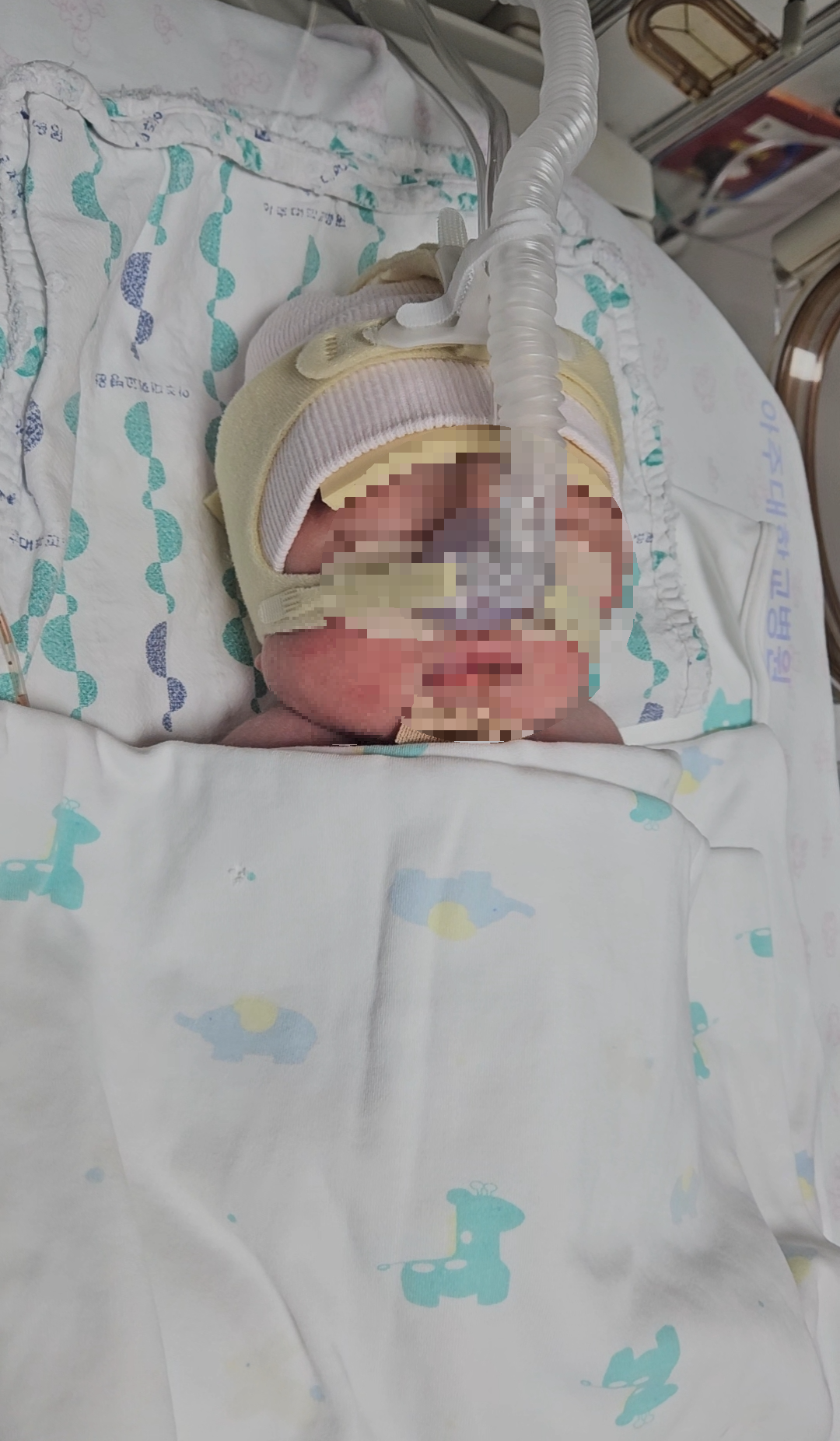 아기는 인큐베이터에 호흡을 보조하는 장치의 도움을 받아서 숨을 쉬고 있었는데 숨쉬기가 힘들어 보였다.