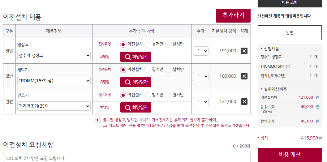 저희가 옮길 LG가전은 세탁기와 건조기가 2단으로 되어 있는 제품과 정수기 냉장고였습니다. 건조기 선택하는게 약간 헷갈릴 수 있는데 세탁기 위에 2단으로 위치해 있으면 전기건조기 2단을 선택해서 가격 견적을 받으면 됩니다. 저희는 총 415,900원이 나왔습니다.